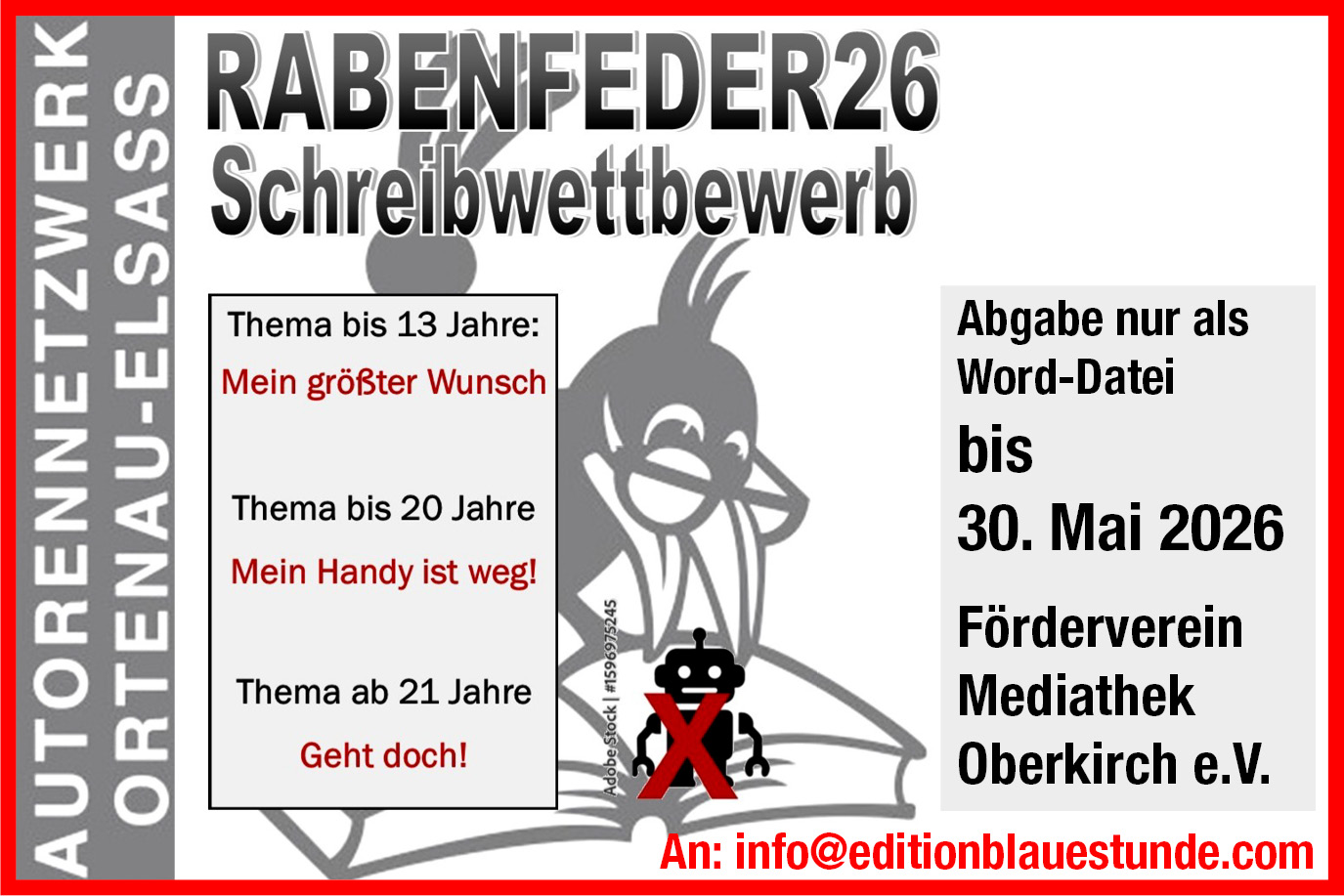 Einladung zum diesjährigen Schreibwettbewerb des AutorenNetzwerks Ortenau-Elsass® und des Fördervereins der Mediathek Oberkirch e.V.